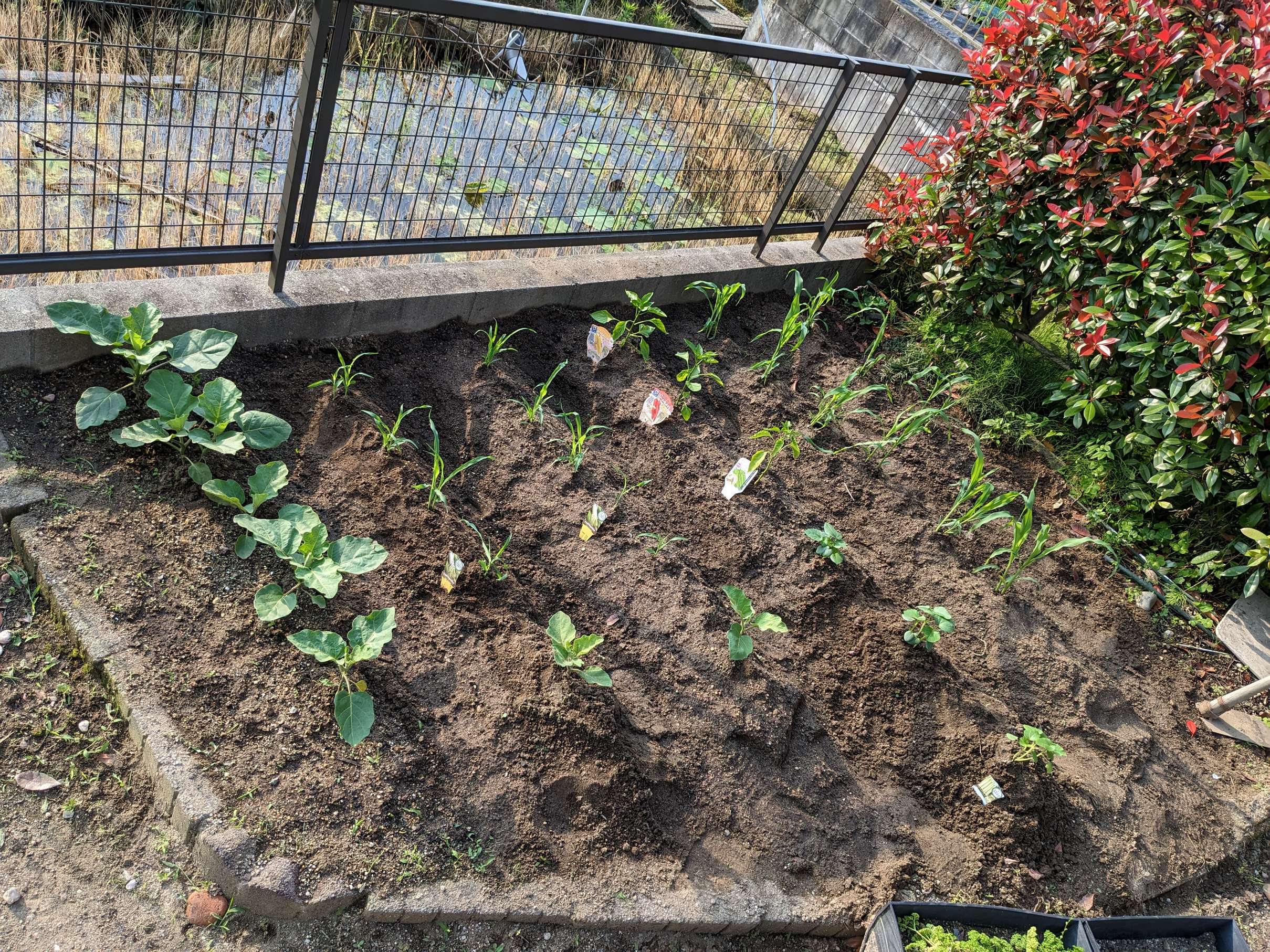 G/W中に土を作り、植え付けは5/20に行い、ナス、とうもろこし、オクラ、ピーマンと今年は種類を増やしてみました。