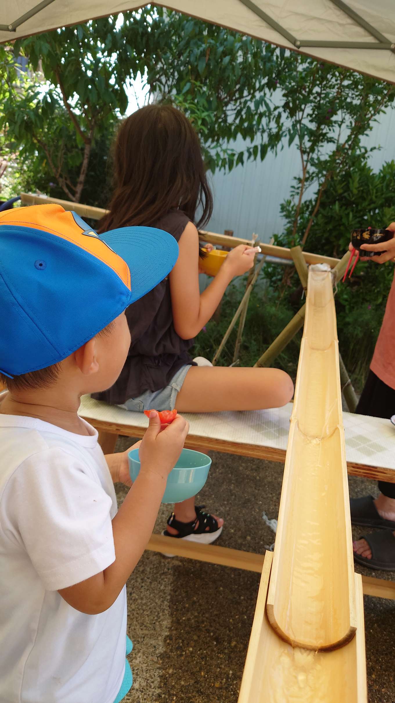 外で天気もよく、バーベキューと竹で作った流し素麺をして楽しみました。
